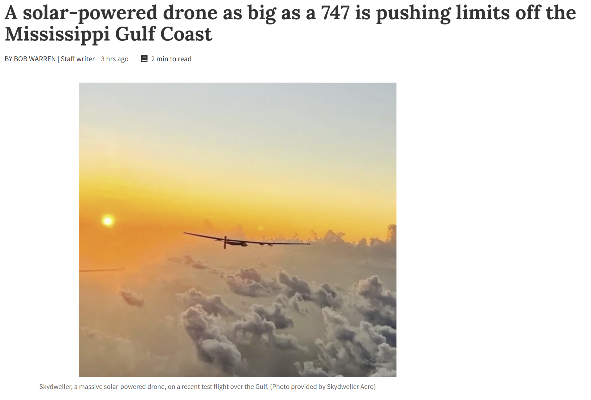 The Times-Picayune / NOLA.com, the Gulf Coast’s largest and most influential newspaper, is shining a spotlight on Skydweller Aero’s record-setting solar-powered flights from our base at Stennis International Airport.